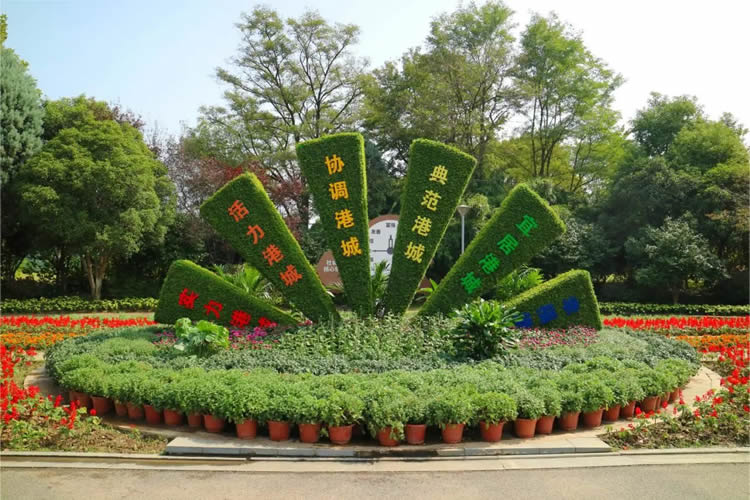造型设在时钟广场中心位置,以张家港所获得的六大荣誉制作五色草折扇造型,富有传统文化色彩的折扇,表现着港城的传承与发展。