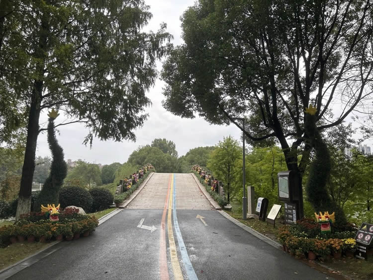 各主要展区之间的道路两旁分布有各具特色的景观节点,如花境小品——七彩河流、中式框景、菊伞长廊、晒菊、探索太空......